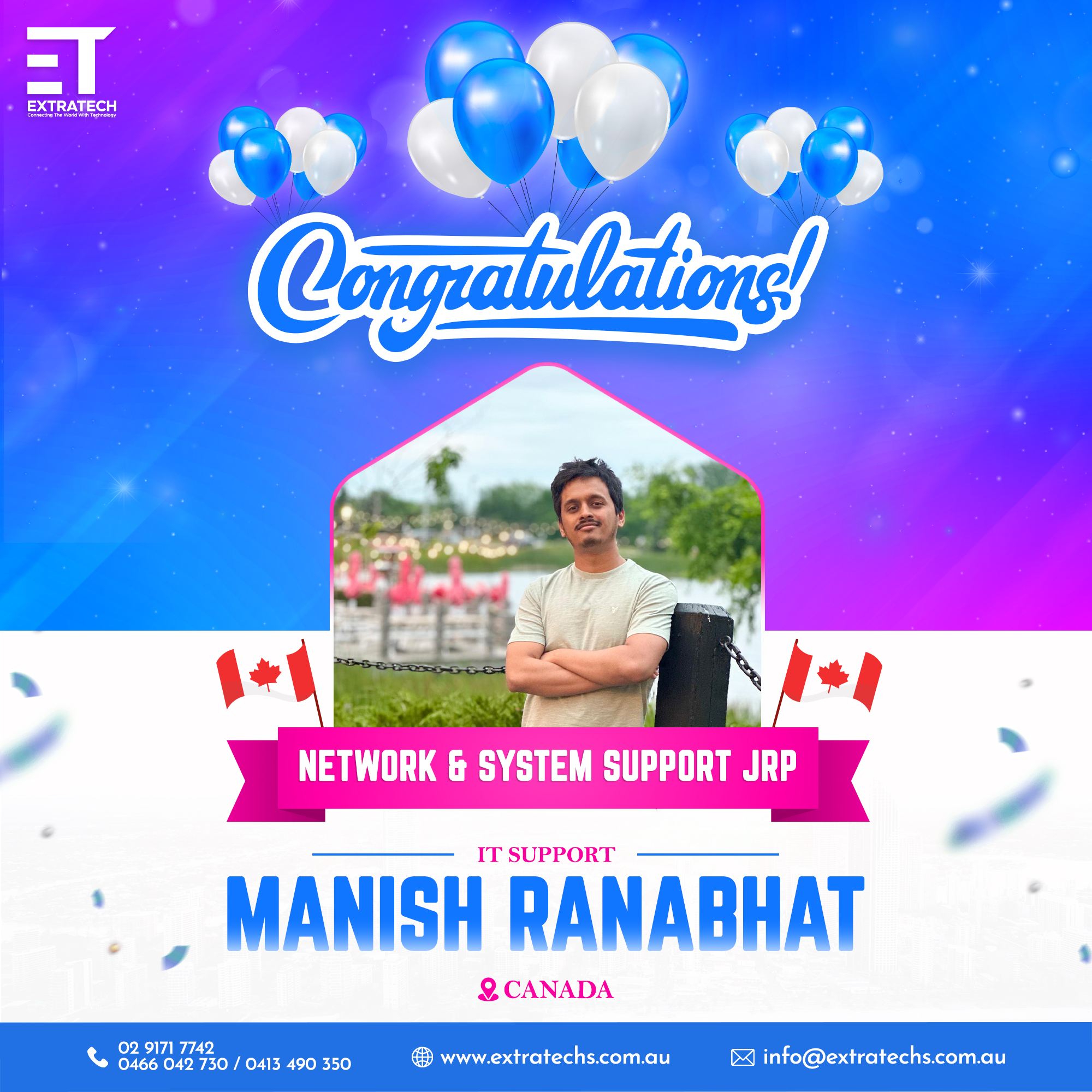 Thanks to the entire Extratech team for creating this opportunity and for continuous support, guidance and encouragement during the job-seeking period. It would not be possible without your help. I will always be grateful to you all.